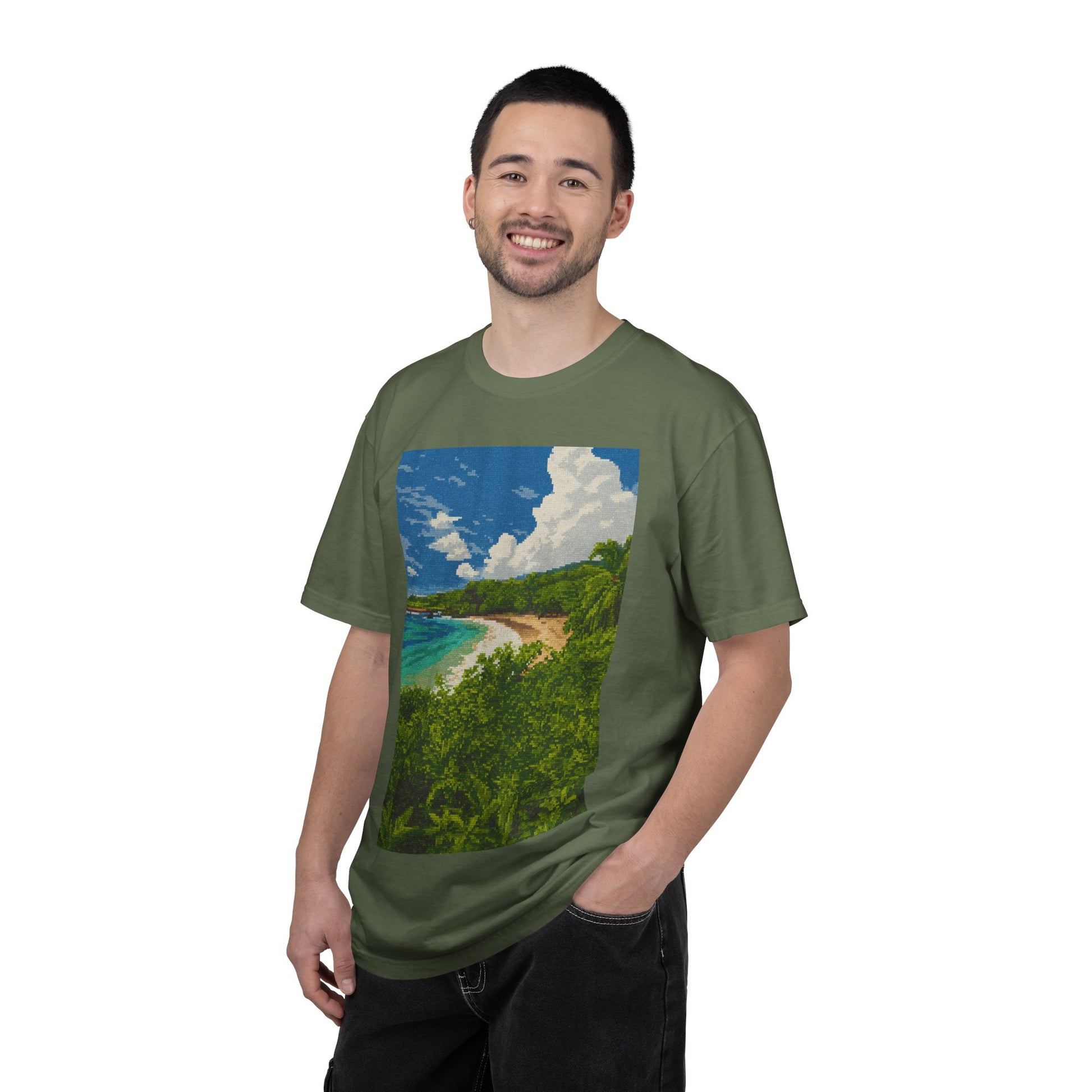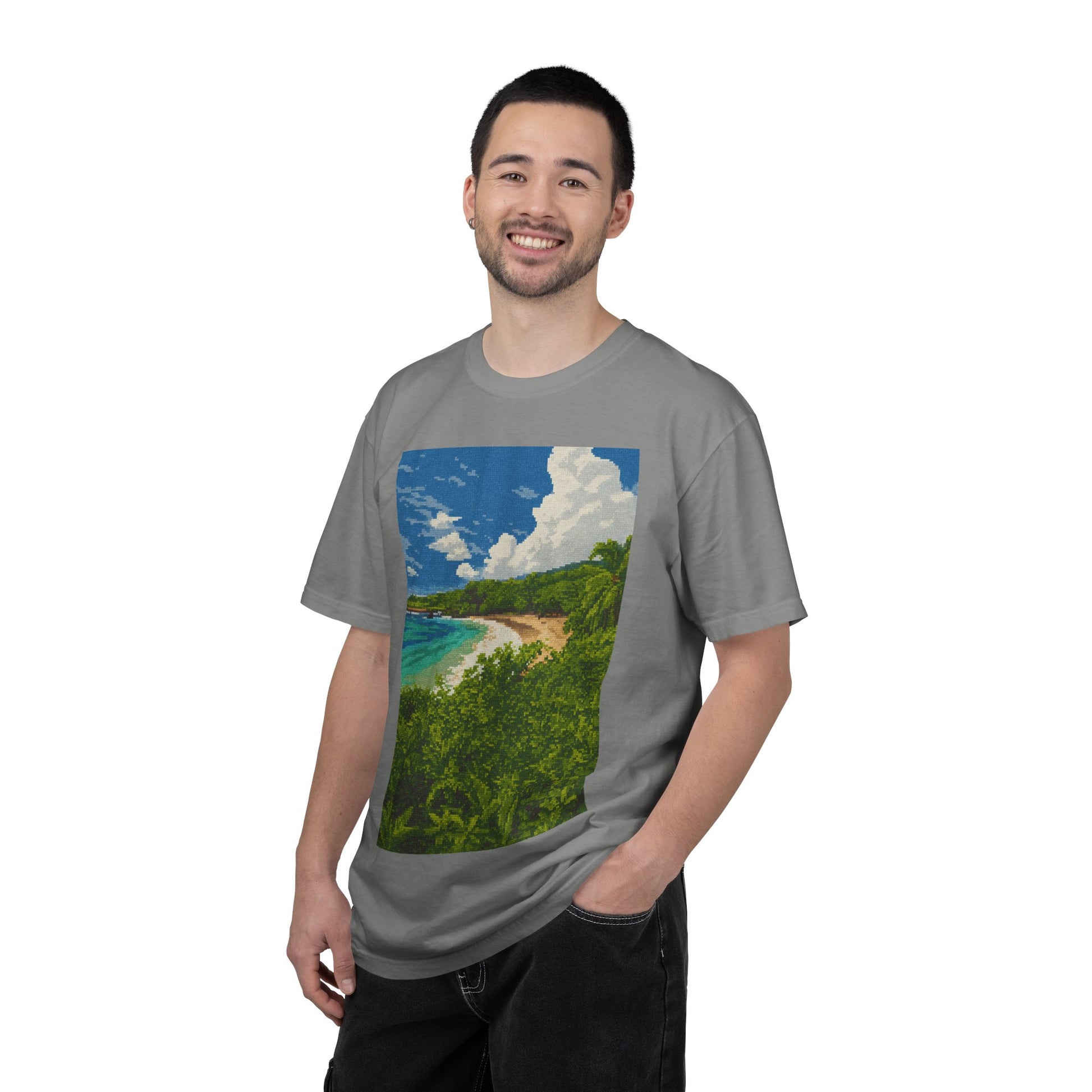 This heavyweight garment-dyed tee brings a slice of coastline to everyday wear. The relaxed fit and soft, washed-in color create an easy, lived-in feel — like a beach day you can carry with you. A vivid coastal print sits centered on the chest, with bright blues, deep greens and sunlit sand that catch the eye without shouting. Durable double-needle stitching and tubular construction mean this shirt hangs right and ages beautifully. Wear it for slow weekend mornings, post-surf strolls, or city days when you want a quiet reminder of salty air and warm horizons.